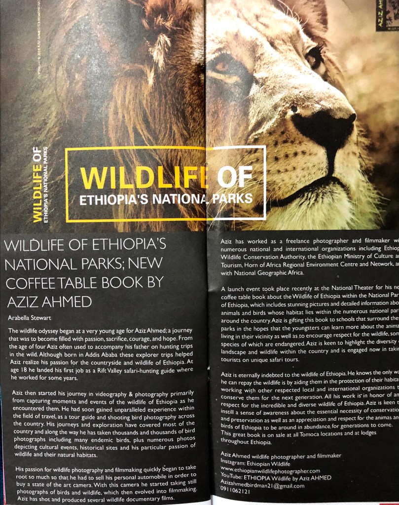 The film, which took a year in making, was launched in front of an audience of 190 attendees comprising of high-ranking government officials, wildlife conservation experts, and NGO representatives at the Sheraton Addis on December 5, 2015 and was deemed a great success for Aziz Ahmed. Aziz is now inspired to make the second volume of this film highlighting the remaining National Parks of Ethiopia. Upcoming projects also include a 1 hour documentary film for every National Park of Ethiopia, a 200 page photo book on all the National Parks, and a book on the Birds of Ethiopia. Aziz also plans to work on producing films on important issues such as poaching, trafficking, illegal hunting and climate change.