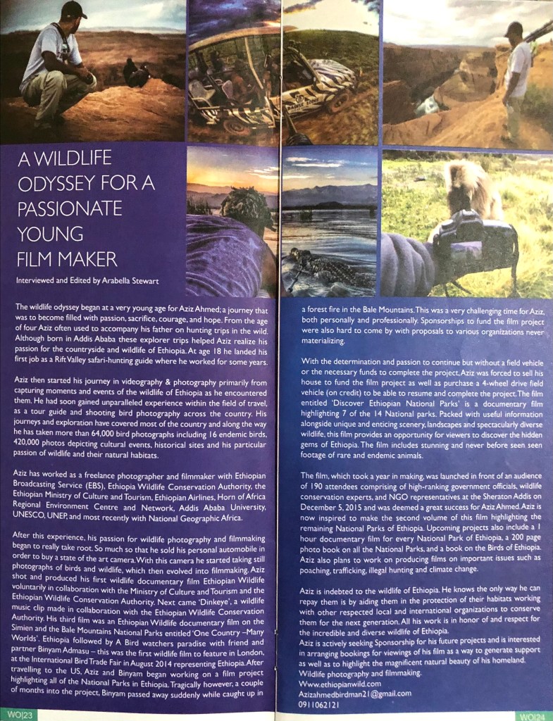 After this experience, his passion for wildlife photography and filmmaking began to really take root. So much so that he sold his personal automobile in order to buy a state of the art camera. With this camera he started taking still photographs of birds and wildlife, which then evolved into filmmaking. Aziz shot and produced his first wildlife documentary film Ethiopian Wildlife voluntarily in collaboration with the Ministry of Culture and Tourism and the Ethiopian Wildlife Conservation Authority. Next came ‘Dinkeye’, a wildlife music clip made in collaboration with the Ethiopian Wildlife Conservation Authority. His third film was an Ethiopian Wildlife documentary film on the Simien and the Bale Mountains National Parks entitled ‘One Country –Many Worlds’. Ethiopia followed by A Bird watchers paradise with friend and partner Binyam Admasu – this was the first wildlife film to feature in London, at the International Bird Trade Fair in August 2014 representing Ethiopia. After travelling to the US, Aziz and Binyam began working on a film project highlighting all of the National Parks in Ethiopia. Tragically however, a couple of months into the project, Binyam passed away suddenly while caught up in a forest fire in the Bale Mountains. This was a very challenging time for Aziz, both personally and professionally. Sponsorships to fund the film project were also hard to come by with proposals to various organizations never materializing.